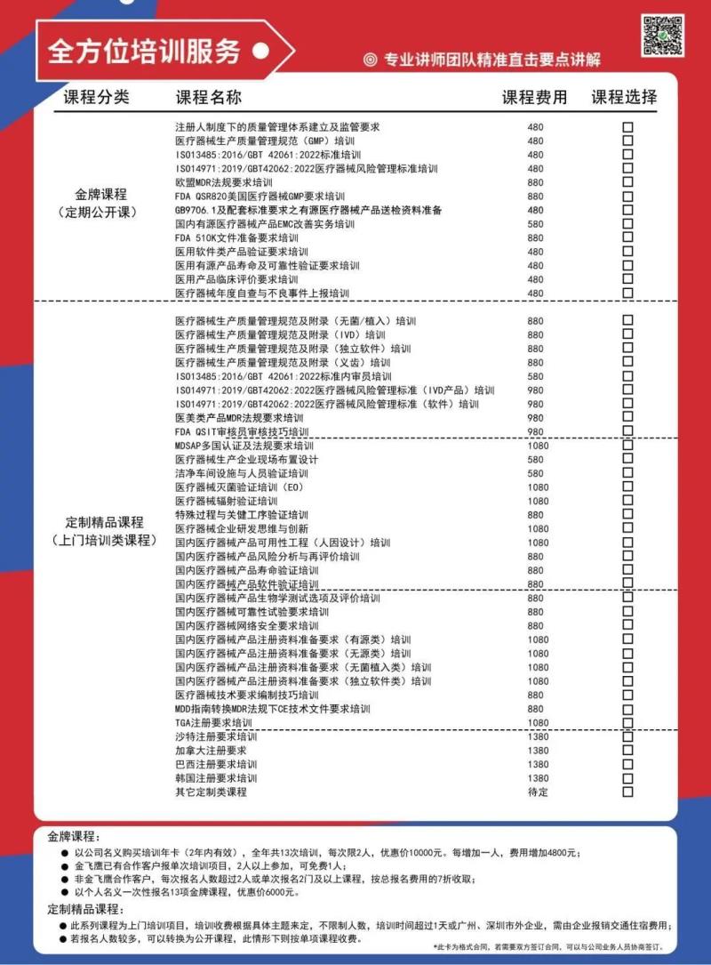 培訓(xùn)分為定期線下公開課及上門培訓(xùn)兩種形式,共有13節(jié)金牌課程+34節(jié)定制精品課程(詳見下方海報),課程主題涵蓋了醫(yī)療器械國內(nèi)外注冊及體系的多個環(huán)節(jié)、多個領(lǐng)域,優(yōu)選金飛鷹具備豐富專業(yè)知識及實戰(zhàn)經(jīng)驗的技術(shù)及項目老師,為學(xué)員提供全方位、高質(zhì)量的醫(yī)療器械注冊指導(dǎo)。感興趣的可掃描下方二維碼報名哦~