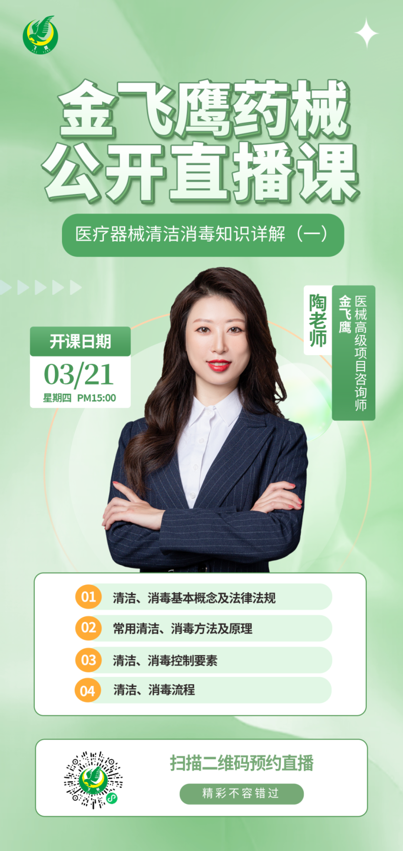 3月21日下午3點,金飛鷹高級項目咨詢師,負責過多種無菌和植入耗材類醫(yī)療器械產品國外委托生產&國內技術轉移項目,對醫(yī)療器械消毒滅菌頗有研究的陶老師,給大家?guī)?/span>《醫(yī)療器械清潔消毒知識詳解(一)》,培訓內容包括清潔/消毒基本概念及法律法規(guī)、常用清潔/消毒方法及原理、清潔/消毒控制要素、清潔/消毒流程等,因涉及到的內容較多,這一主題將分為兩期內容來講,大家記得要持續(xù)關注哦!