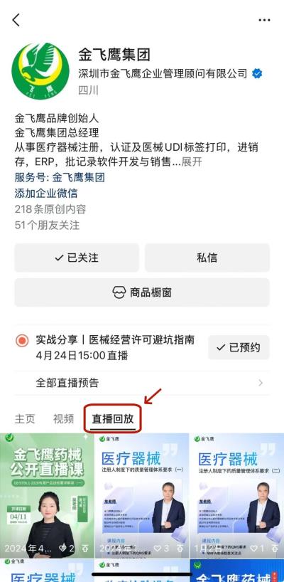 往期直播培訓(xùn)課程支持回放,關(guān)注“金飛鷹藥械咨詢服務(wù)”視頻號并點擊視頻號主頁,即可查看“直播回放”哦~