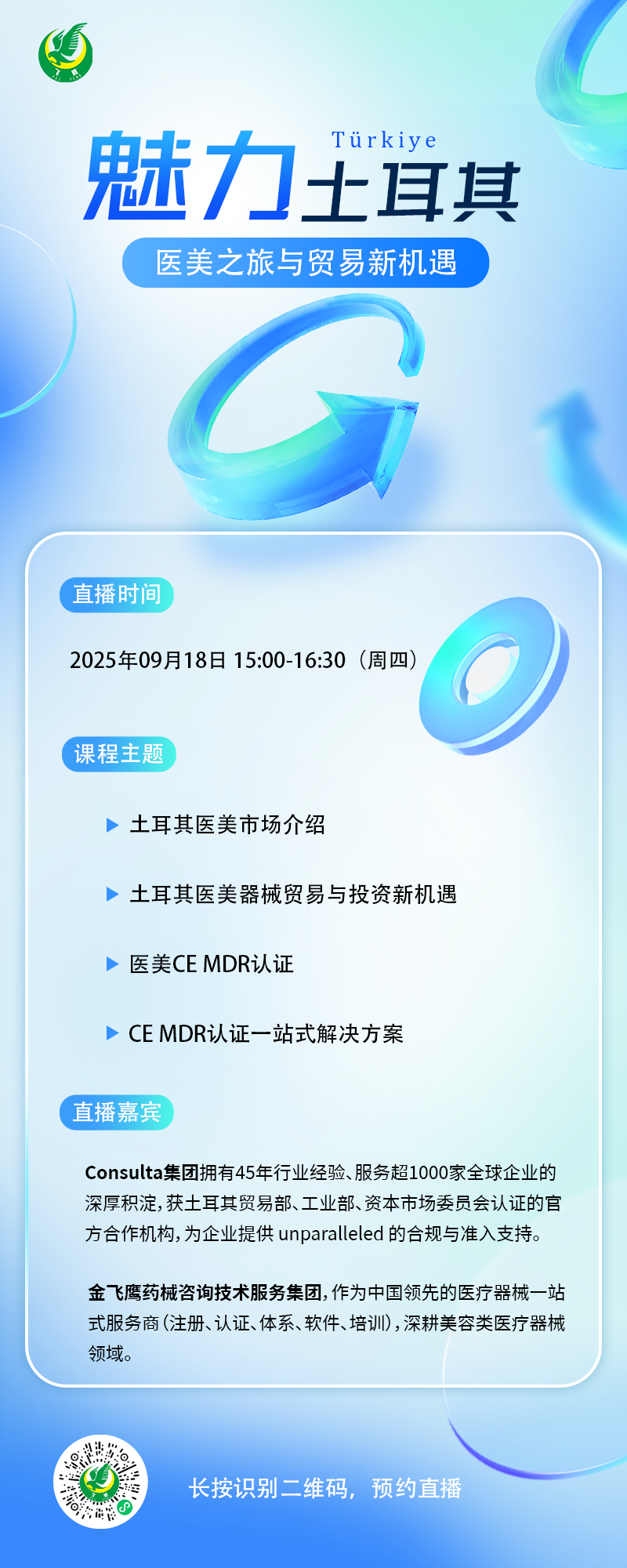 2025年9月18日(周四)下午15:00,金飛鷹藥械咨詢技術(shù)服務(wù)集團將攜手土耳其Natural Clinic、Consulta Group、Investo Global等多家戰(zhàn)略合作伙伴,聯(lián)合舉辦“魅力土耳其:雙軌掘金——醫(yī)美之旅與貿(mào)易新機遇”線上分享交流會,為您全面揭開土耳其市場的無限潛力!