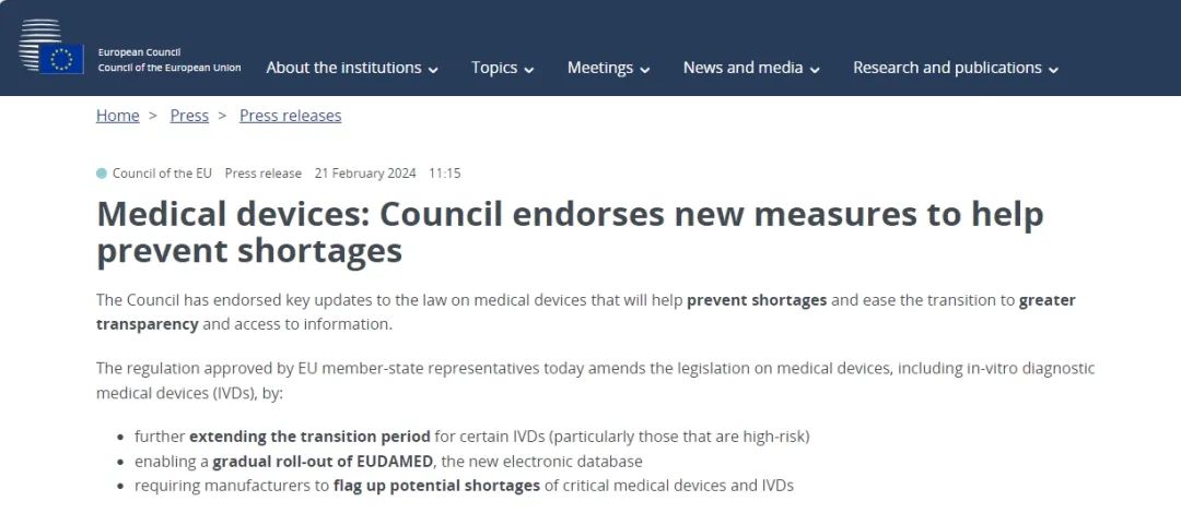 當(dāng)?shù)貢r(shí)間2024年2月21日,歐盟理事會(huì)發(fā)布一則新聞稿稱,歐盟成員國(guó)代表已于2024年2月14日正式批準(zhǔn)歐盟委員會(huì)2024年1月23日提出的醫(yī)療器械[包括體外診斷醫(yī)療器械(IVD)]修訂案提案(戳此回顧→IVDR過(guò)渡期再延長(zhǎng)),并對(duì)提案內(nèi)容不做任何修改: