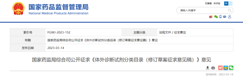 3月14日,國家藥監(jiān)局官網(wǎng)發(fā)布公告稱,為貫徹落實新修訂的《醫(yī)療器械監(jiān)督管理條例》《體外診斷試劑注冊與備案管理辦法》及《體外診斷試劑分類規(guī)則》中體外診斷試劑分類管理的要求,夯實體外診斷試劑分類管理基礎(chǔ),國家藥監(jiān)局組織開展了《體外診斷試劑分類目錄》修訂工作,形成了《體外診斷試劑分類目錄(修訂草案征求意見稿)》(以下簡稱《征求意見稿》),并向社會公開征求意見。