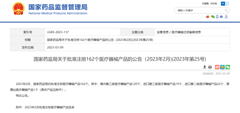 據(jù)國家藥監(jiān)局官網(wǎng)最新公告,2023年2月,國家藥監(jiān)局共批準(zhǔn)注冊醫(yī)療器械產(chǎn)品162個。其中,境內(nèi)第三類醫(yī)療器械產(chǎn)品120個,進口第三類醫(yī)療器械產(chǎn)品19個,進口第二類醫(yī)療器械產(chǎn)品22個,港澳臺醫(yī)療器械產(chǎn)品1個(具體產(chǎn)品見附件)。