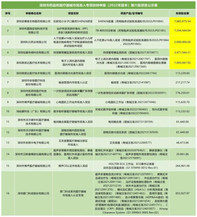 近日,深圳市發(fā)展和改革委員會(huì)官網(wǎng)發(fā)布《深圳市藥品和醫(yī)療器械市場(chǎng)準(zhǔn)入專項(xiàng)扶持申報(bào)(2022年版本)第六批擬資助項(xiàng)目的公示》,包括深圳市貝斯曼精密儀器有限公司的超聲多普勒外周血管檢測(cè)儀/靜脈顯像儀/醫(yī)用紅外體溫計(jì)國(guó)內(nèi)市場(chǎng)準(zhǔn)入項(xiàng)目、深圳市沃爾德外科醫(yī)療器械技術(shù)有限公司的椎間融合器/頸椎后路內(nèi)固定系統(tǒng)醫(yī)療器械市場(chǎng)準(zhǔn)入項(xiàng)目、深圳市老郎中電子有限公司的艾灸裝置醫(yī)療器械注冊(cè)證市場(chǎng)準(zhǔn)入等在內(nèi)的共計(jì)16個(gè)項(xiàng)目,其中擬資助金額最高為788萬余元,而100萬元以上的共有5個(gè)項(xiàng)目(已用黃色標(biāo)注),具體明細(xì)如下: