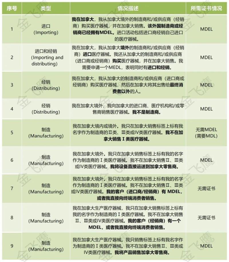 對比2020年版指南文件[ Guidance on Medical Device Establishment Licensing (GUI-0016) version 8(April 1, 2020)],要求持有MDEL的情形(指南文件表1)稍有變動,我們將最新表格翻譯轉(zhuǎn)載如下: