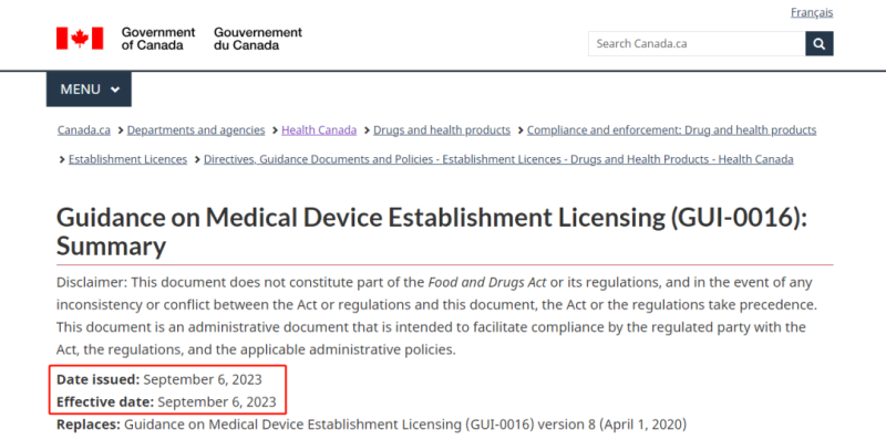 9月6日,加拿大更新了與醫(yī)療器械企業(yè)許可證(Medical Device Eestablishment Licensing)相關的監(jiān)管要求指南文件。