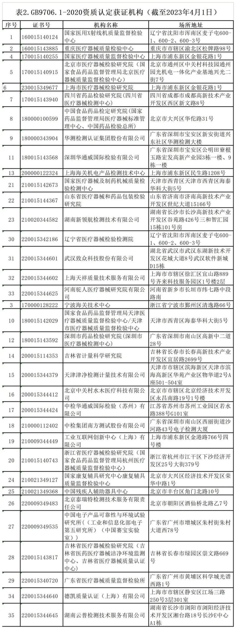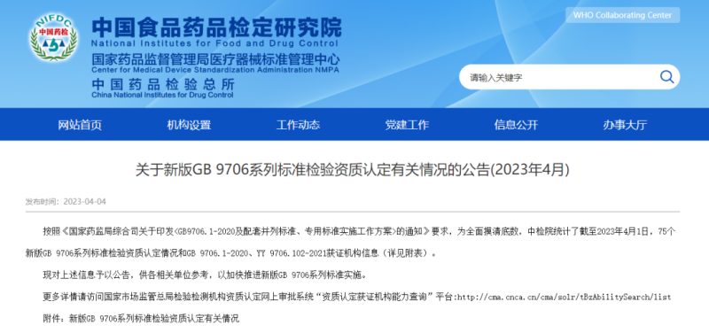 近日,中檢院官網(wǎng)發(fā)布《關(guān)于新版GB 9706系列標(biāo)準(zhǔn)檢驗資質(zhì)認(rèn)定有關(guān)情況的公告(2023年4月)》(以下簡稱《公告》),公布了截至2023年4月1日,75個新版GB 9706系列標(biāo)準(zhǔn)檢驗資質(zhì)認(rèn)定情況和GB 9706.1-2020、YY 9706.102-2021獲證機構(gòu)信息(詳見文末附件),其中GB 9706.1-2020資質(zhì)認(rèn)定獲證機構(gòu)具體如下: