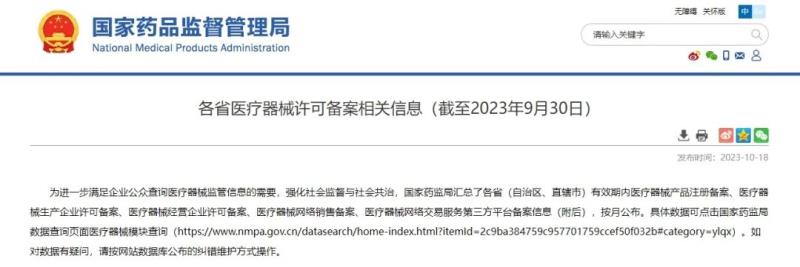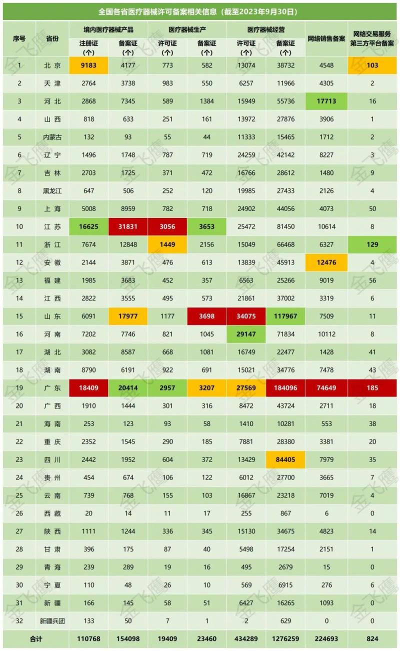 10月18日,國家藥監(jiān)局公布了截至2023年9月30日各省有效期內(nèi)醫(yī)療器械產(chǎn)品注冊備案、醫(yī)療器械生產(chǎn)企業(yè)許可備案等信息,老規(guī)矩,金飛鷹小編對(duì)此稍作編輯,標(biāo)注紅色、綠色、黃色的分別為前三甲。
