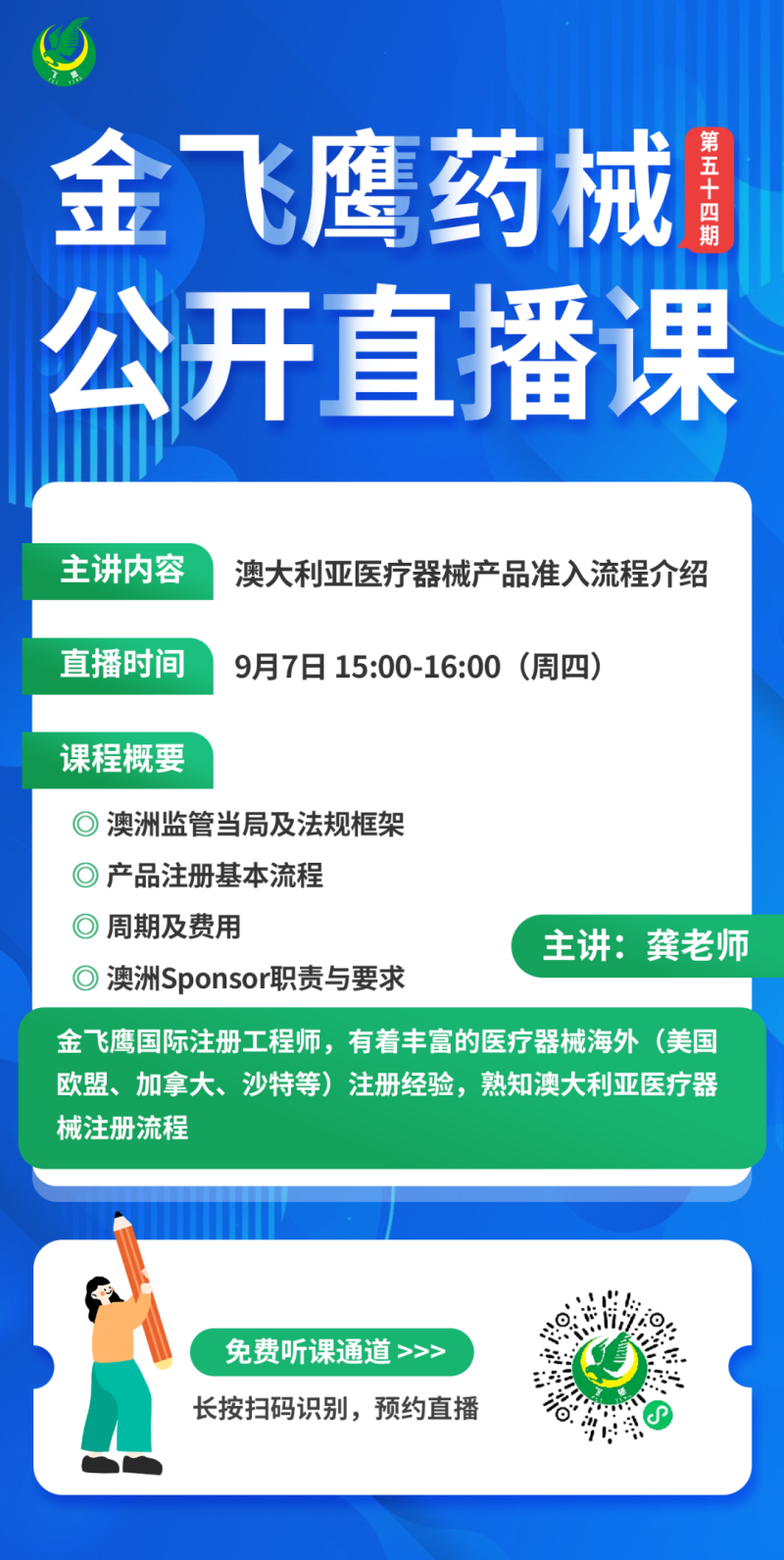 金飛鷹直播培訓(xùn),是每周一次的固定培訓(xùn)欄目,優(yōu)選金飛鷹國(guó)內(nèi)外資深注冊(cè)/項(xiàng)目老師定期為大家講解醫(yī)療器械注冊(cè)相關(guān)知識(shí),解答大家在醫(yī)療器械注冊(cè)過(guò)程中的諸多疑問(wèn)。