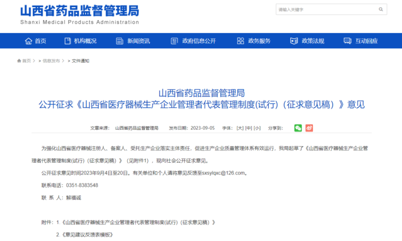 近日,山西省藥監(jiān)局官網(wǎng)發(fā)布《山西省醫(yī)療器械生產(chǎn)企業(yè)管理者代表管理制度(試行)(征求意見稿)》(以下簡稱《征求意見稿》),并向社會(huì)公開征求意見。