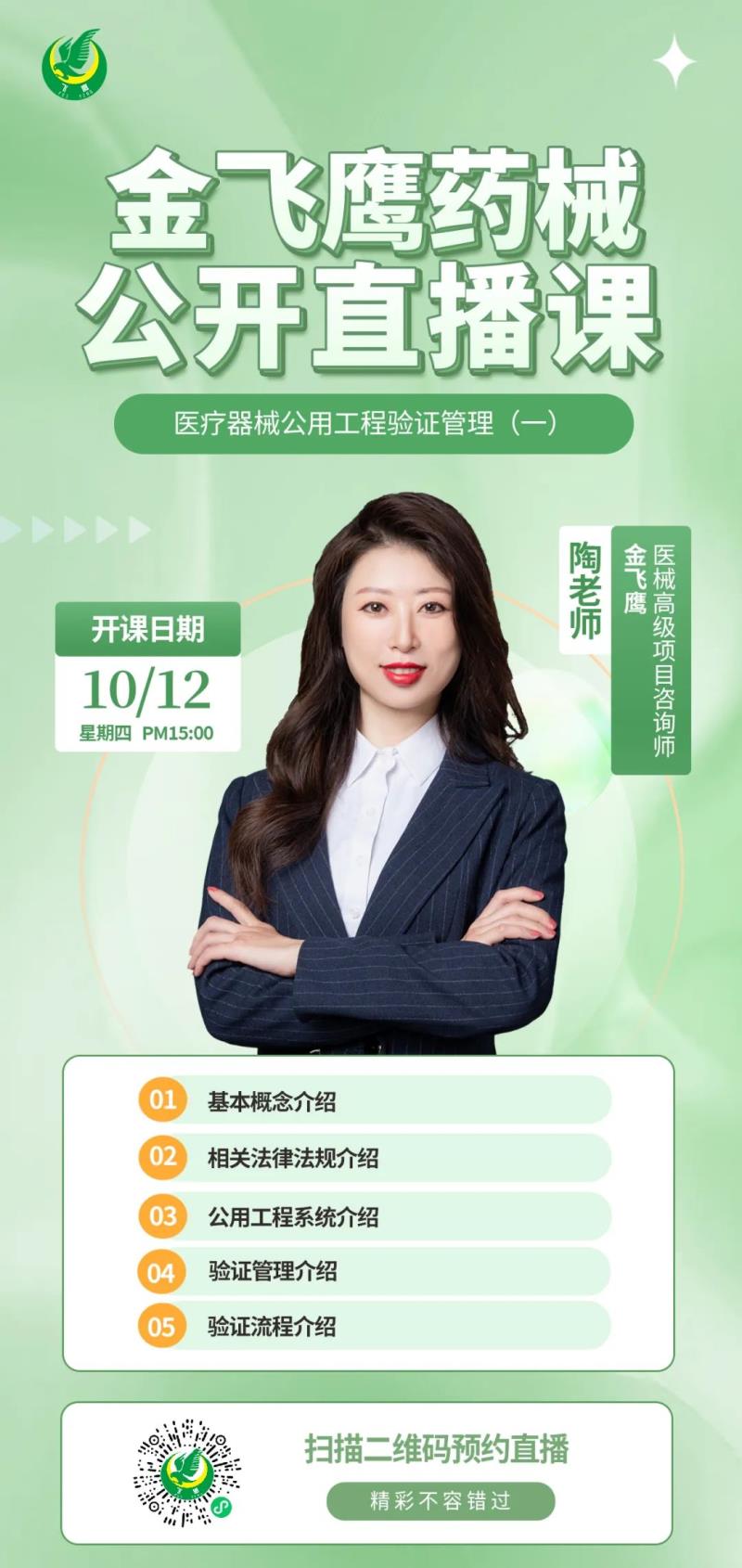 10月12日下午3點(diǎn),金飛鷹高級項(xiàng)目咨詢師,有著15年工廠管理、7年質(zhì)量經(jīng)理及廠長經(jīng)驗(yàn),曾主導(dǎo)多個Ⅱ類&Ⅲ類醫(yī)療器械廠房項(xiàng)目建設(shè)的陶老師,給大家?guī)怼夺t(yī)療器械公用工程驗(yàn)證管理(一)》,培訓(xùn)內(nèi)容包括基本概念介紹、相關(guān)法律法規(guī)介紹、公用工程系統(tǒng)介紹、驗(yàn)證管理介紹、驗(yàn)證流程介紹等,大家千萬不要錯過了哦!