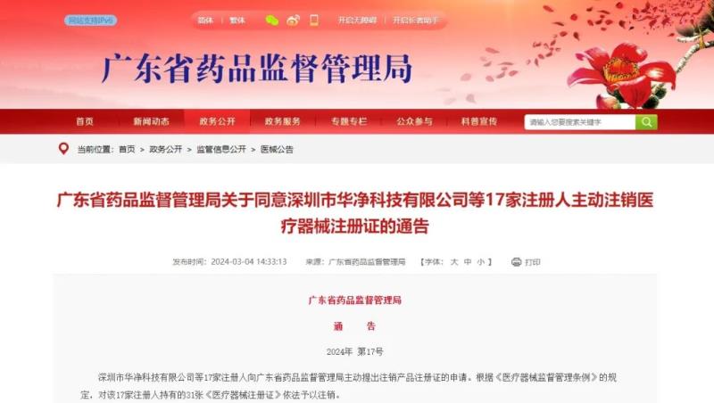 3月4日,廣東藥監(jiān)局發(fā)布通告稱,深圳市華凈科技有限公司等17家注冊人向廣東省藥品監(jiān)督管理局主動提出注銷產(chǎn)品注冊證的申請,注銷產(chǎn)品以醫(yī)用口罩居多,還有紅外體溫計(jì)、額溫計(jì)、電子血壓計(jì)等。根據(jù)《醫(yī)療器械監(jiān)督管理?xiàng)l例》的規(guī)定,該局對該17家注冊人持有的31張《醫(yī)療器械注冊證》依法予以注銷。具體注銷清單如下: