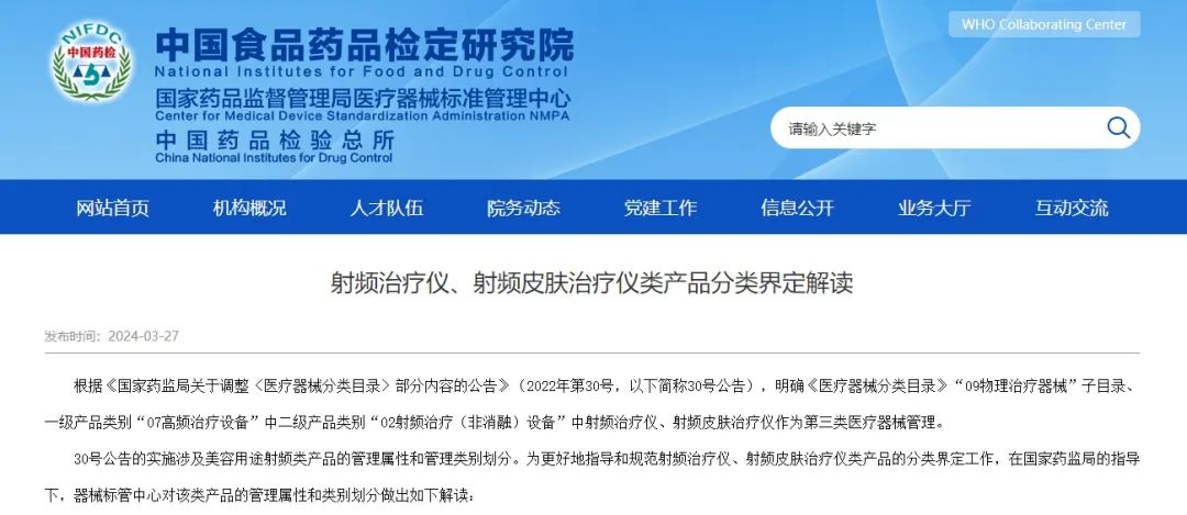 隨著這一監(jiān)管日期的臨近,3月27日,國(guó)家藥監(jiān)局醫(yī)療器械標(biāo)準(zhǔn)管理中心對(duì)射頻治療儀、射頻皮膚治療儀類產(chǎn)品的管理屬性和類別劃分做出解讀,具體如下: