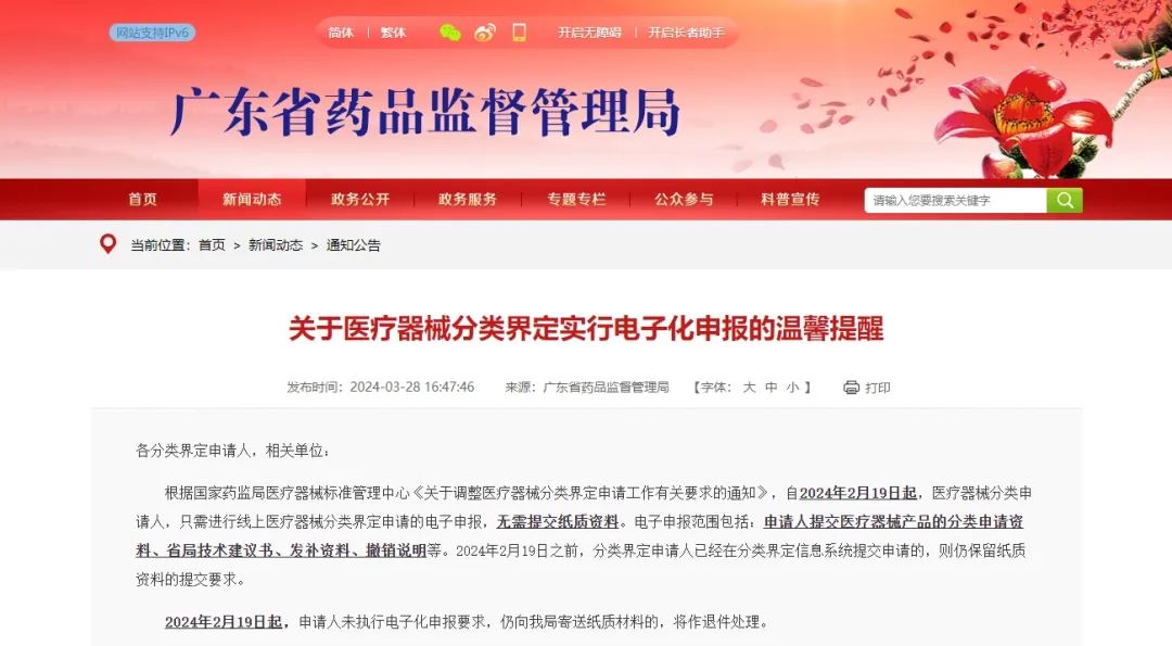 3月28日,廣東省藥監(jiān)局發(fā)布《關(guān)于醫(yī)療器械分類界定實(shí)行電子化申報(bào)的溫馨提醒》,其中提到,自2024年2月19日起,醫(yī)療器械分類申請人,只需進(jìn)行線上醫(yī)療器械分類界定申請的電子申報(bào),無需提交紙質(zhì)資料。電子申報(bào)范圍包括:申請人提交醫(yī)療器械產(chǎn)品的分類申請資料、省局技術(shù)建議書、發(fā)補(bǔ)資料、撤銷說明等。2024年2月19日之前,分類界定申請人已經(jīng)在分類界定信息系統(tǒng)提交申請的,則仍保留紙質(zhì)資料的提交要求。