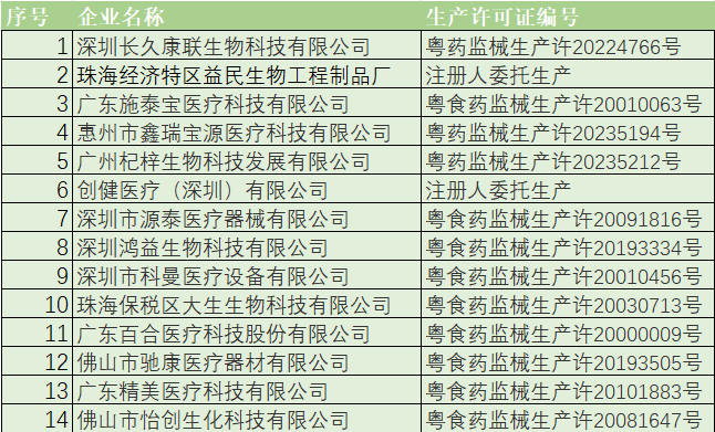 近期,廣東省藥品監(jiān)督管理局組織開展醫(yī)療器械生產(chǎn)企業(yè)監(jiān)督檢查,發(fā)現(xiàn)以下14家企業(yè)質(zhì)量管理體系存在嚴(yán)重缺陷,不符合《醫(yī)療器械生產(chǎn)質(zhì)量管理規(guī)范》相關(guān)規(guī)定,廣東省藥品監(jiān)督管理局已依法采取責(zé)令暫停生產(chǎn)的控制措施。