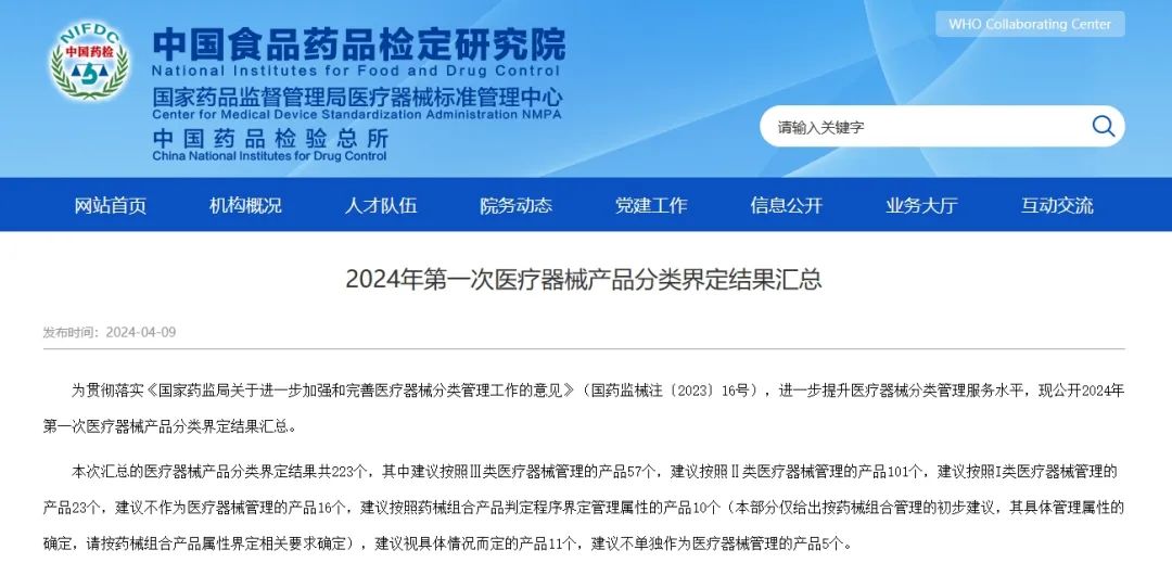 4月9日,國家藥監(jiān)局醫(yī)療器械標(biāo)準(zhǔn)管理中心發(fā)布《2024年第一次醫(yī)療器械產(chǎn)品分類界定結(jié)果匯總》,本次共匯總了223個醫(yī)療器械產(chǎn)品分類界定結(jié)果,其中建議按照Ⅲ類醫(yī)療器械管理的產(chǎn)品57個,建議按照Ⅱ類醫(yī)療器械管理的產(chǎn)品101個,建議按照Ⅰ類醫(yī)療器械管理的產(chǎn)品23個,建議不作為醫(yī)療器械管理的產(chǎn)品16個,建議按照藥械組合產(chǎn)品判定程序界定管理屬性的產(chǎn)品10個,建議視具體情況而定的產(chǎn)品11個,建議不單獨(dú)作為醫(yī)療器械管理的產(chǎn)品5個。