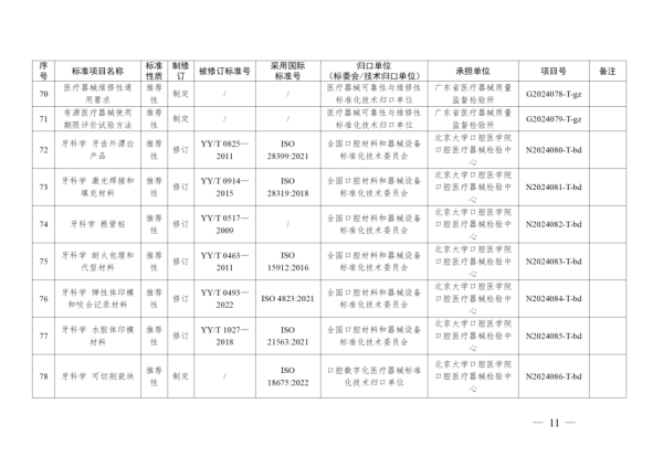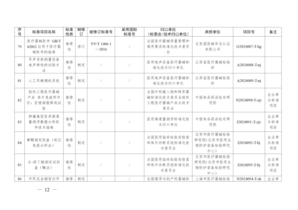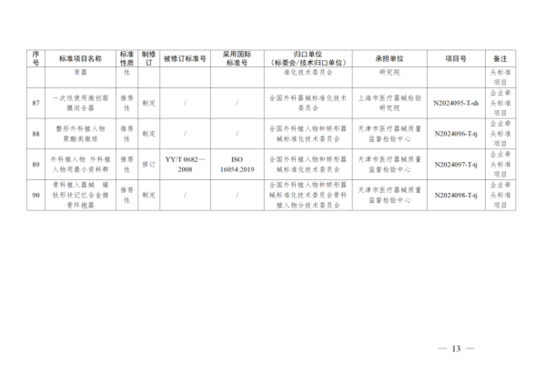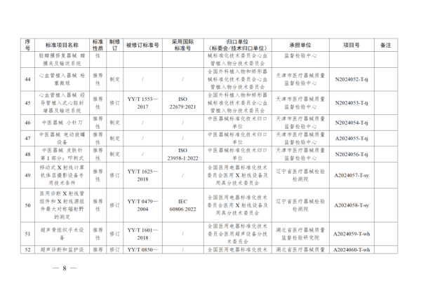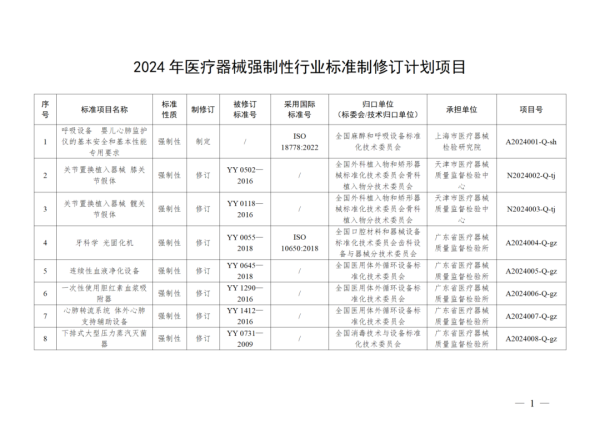 4月11日,國家藥監(jiān)局發(fā)布2024年醫(yī)療器械行業(yè)標(biāo)準(zhǔn)制修訂計(jì)劃,其中包含《呼吸設(shè)備  嬰兒心肺監(jiān)護(hù)儀的基本安全和基本性能專用要求》等8項(xiàng)強(qiáng)制性標(biāo)準(zhǔn)及《紫外治療設(shè)備》《注射用透明質(zhì)酸鈉溶液》等90項(xiàng)推薦性標(biāo)準(zhǔn),具體如下: