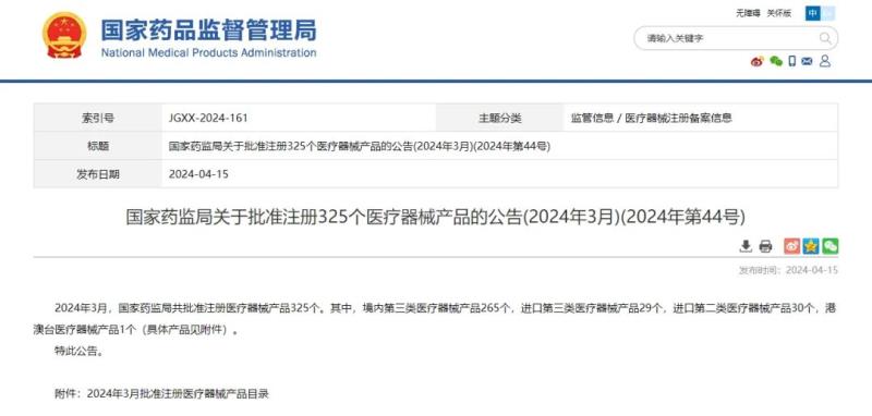 4月15日,國(guó)家藥監(jiān)局官網(wǎng)發(fā)布公告稱(chēng),2024年3月,國(guó)家藥監(jiān)局共批準(zhǔn)注冊(cè)醫(yī)療器械產(chǎn)品325個(gè)。其中,境內(nèi)第三類(lèi)醫(yī)療器械產(chǎn)品265個(gè),進(jìn)口第三類(lèi)醫(yī)療器械產(chǎn)品29個(gè),進(jìn)口第二類(lèi)醫(yī)療器械產(chǎn)品30個(gè),港澳臺(tái)醫(yī)療器械產(chǎn)品1個(gè)。