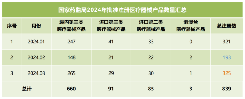 我們同步匯總了2024年第一季度國(guó)家藥監(jiān)局批準(zhǔn)注冊(cè)的醫(yī)療器械產(chǎn)品數(shù)量(見(jiàn)下方表格),從表格中可以看出,截至3月,2024年國(guó)家藥監(jiān)局總計(jì)批準(zhǔn)注冊(cè)醫(yī)療器械產(chǎn)品839個(gè),其中境內(nèi)第三類(lèi)醫(yī)療器械產(chǎn)品660個(gè),進(jìn)口第三類(lèi)醫(yī)療器械產(chǎn)品91個(gè),進(jìn)口第二類(lèi)醫(yī)療器械產(chǎn)品85個(gè),港澳臺(tái)醫(yī)療器械產(chǎn)品3個(gè)。