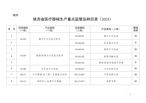 近日,陜西省藥監(jiān)局公布《陜西省醫(yī)療器械生產(chǎn)重點(diǎn)監(jiān)管品種目錄》(2024)(以下簡(jiǎn)稱《目錄》),我們通過查看附件發(fā)現(xiàn),《目錄》中共包含超聲治療設(shè)備附件、醫(yī)用分子篩制氧系統(tǒng)、整形填充材料、整形美容用注射材料、無菌注射器、胰島素泵等139種產(chǎn)品,具體明細(xì)如下: