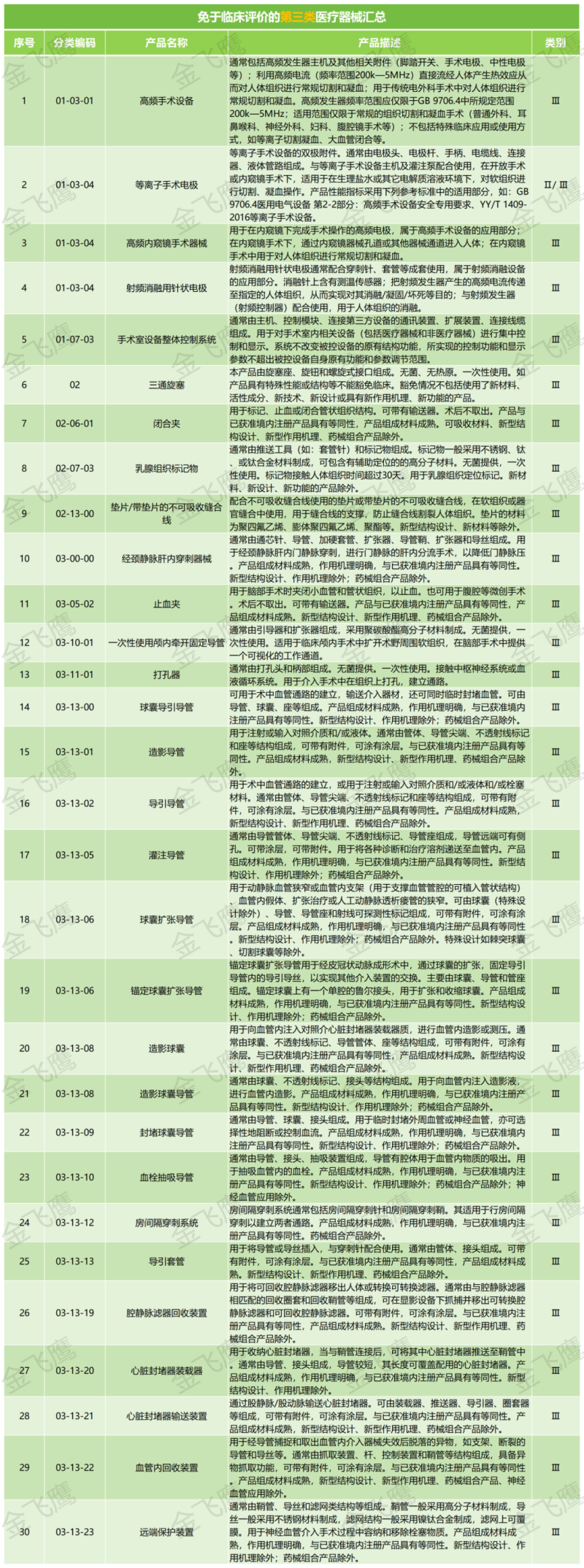 根據(jù)國家藥監(jiān)局發(fā)布的《免于進(jìn)行臨床評價醫(yī)療器械目錄(2023年)》,我們篩選出了免于進(jìn)行臨床評價的第三類醫(yī)療器械產(chǎn)品(共204類產(chǎn)品),部分展示如下: