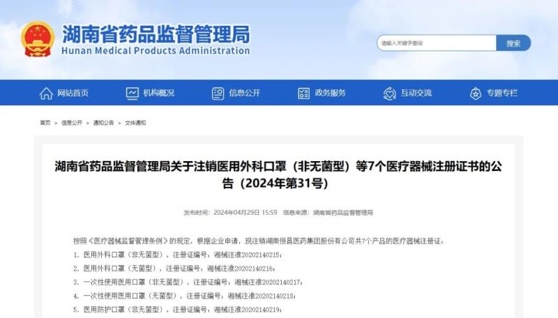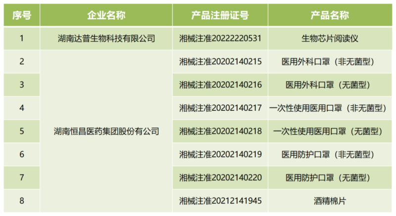 近日,湖南省藥監(jiān)局官網(wǎng)發(fā)布兩則公告稱,按照《醫(yī)療器械監(jiān)督管理?xiàng)l例》的規(guī)定,根據(jù)企業(yè)申請(qǐng),該局已依法注銷湖南恒昌醫(yī)藥集團(tuán)股份有公司、湖南達(dá)普生物科技有限公司2家企業(yè)的共計(jì)8個(gè)醫(yī)療器械注冊(cè)證書,包括醫(yī)用外科口罩、酒精棉片、生物芯片閱讀儀等產(chǎn)品,具體明細(xì)如下: