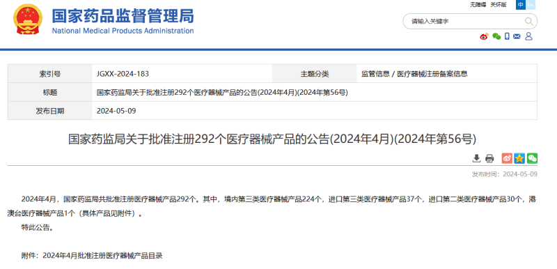 國(guó)家藥監(jiān)局發(fā)布,2024年4月共批準(zhǔn)292個(gè)醫(yī)療器械。1月-4月以來(lái)國(guó)家藥監(jiān)局共批準(zhǔn)注冊(cè)了1131個(gè)醫(yī)療器械產(chǎn)品。