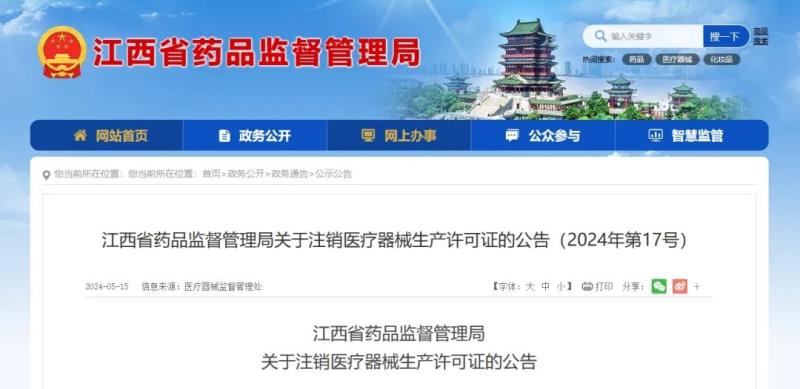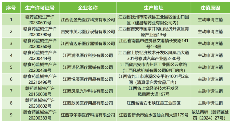 5月15日,江西省藥監(jiān)局官網(wǎng)發(fā)布一則醫(yī)療器械生產(chǎn)許可證注銷(xiāo)公告,公告顯示,該局已依法注銷(xiāo)江西創(chuàng)盈光醫(yī)療科技有限公司、江西省邁樂(lè)醫(yī)療器械有限公司等9家企業(yè)的醫(yī)療器械生產(chǎn)許可證,其中8家為主動(dòng)申請(qǐng)注銷(xiāo),1家為依法吊銷(xiāo),具體明細(xì)如下: