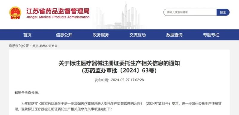 一、自2024年6月1日起,涉及境內(nèi)委托生產(chǎn)的注冊申請或者延續(xù)注冊申請,省局將在醫(yī)療器械注冊證生產(chǎn)地址欄中登載受托生產(chǎn)地址并注明“(委托生產(chǎn))”,同時在備注欄中備注受托生產(chǎn)企業(yè)名稱和統(tǒng)一社會信用代碼,備注形式為“受托生產(chǎn)企業(yè):XXXX(單位名稱);統(tǒng)一社會信用代碼:XXXX”。變更注冊涉及注冊人委托生產(chǎn)的,也將在變更注冊文件中按照上述方式注明委托生產(chǎn)相關(guān)信息。