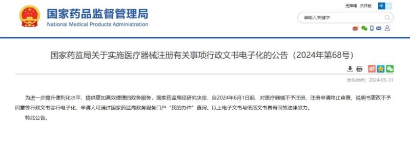 近日,國家藥監(jiān)局發(fā)布公告稱,自2024年6月1日起,對(duì)醫(yī)療器械不予注冊(cè)、注冊(cè)申請(qǐng)終止審查、說明書更改不予同意等行政文書實(shí)行電子化,申請(qǐng)人可通過國家藥監(jiān)局政務(wù)服務(wù)門戶“我的辦件”查詢。以上電子文書與紙質(zhì)文書具有同等法律效力。