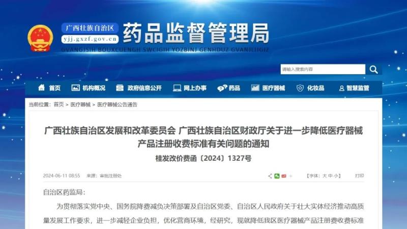 6月11日,廣西壯族自治區(qū)藥監(jiān)局發(fā)布《廣西壯族自治區(qū)發(fā)展和改革委員會 廣西壯族自治區(qū)財政廳關于進一步降低醫(yī)療器械產品注冊收費標準有關問題的通知》,宣布將境內第二類醫(yī)療器械產品首次注冊費由30280元降為20187元;延續(xù)注冊費由12560元降為零,具體內容如下: