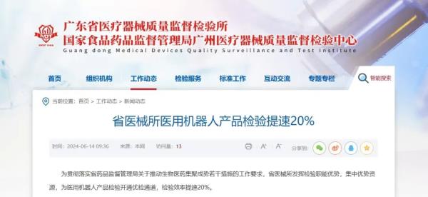 近日,廣東省醫(yī)療器械質(zhì)量監(jiān)督檢驗(yàn)所(以下簡(jiǎn)稱“廣東省醫(yī)械所”)發(fā)布動(dòng)態(tài)稱,為貫徹落實(shí)廣東省藥品監(jiān)督管理局關(guān)于推動(dòng)生物醫(yī)藥集聚成勢(shì)若干措施的工作要求,廣東省醫(yī)械所發(fā)揮檢驗(yàn)職能優(yōu)勢(shì),集中優(yōu)勢(shì)資源,為醫(yī)用機(jī)器人產(chǎn)品檢驗(yàn)開通優(yōu)檢通道,檢驗(yàn)效率提速20%。