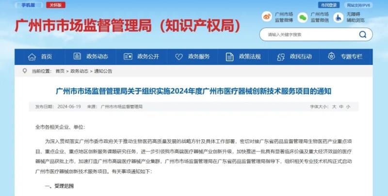 6月19日,廣州市市場監(jiān)督管理局發(fā)布《關于組織實施2024年度廣州市醫(yī)療器械創(chuàng)新技術服務項目的通知》(以下簡稱《通知》),《通知》指出,該局已組織相關專業(yè)技術機構正式啟動廣州市醫(yī)療器械創(chuàng)新技術服務項目。具體事項如下: