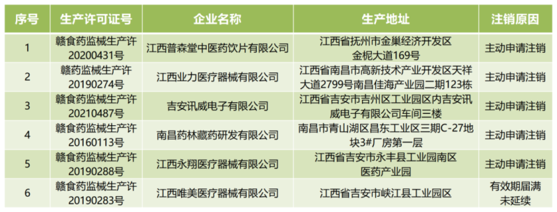 近日,江西省藥監(jiān)局發(fā)布公告稱,由于企業(yè)主動(dòng)申請或有效期屆滿未延續(xù),該局已依法注銷了江西普森堂中醫(yī)藥飲片有限公司、江西業(yè)力醫(yī)療器械有限公司6家企業(yè)的《醫(yī)療器械生產(chǎn)許可證》。具體明細(xì)如下: