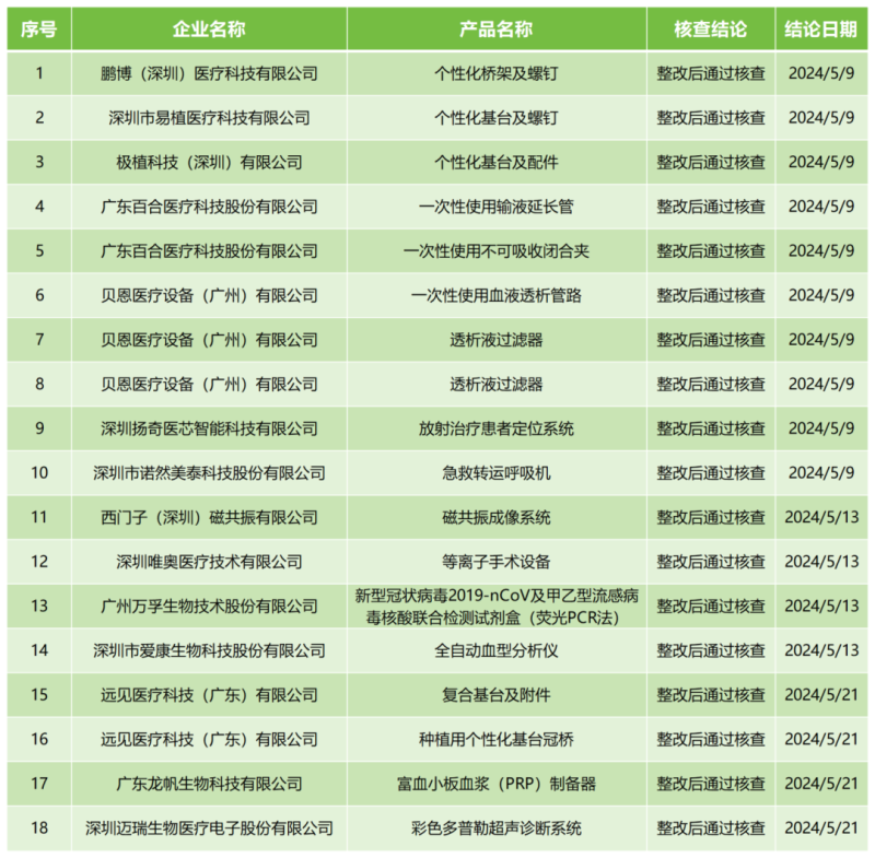 6月25日,廣東省藥監(jiān)局官網(wǎng)公布2024年5月醫(yī)療器械注冊(cè)質(zhì)量管理體系核查結(jié)果,包括西門子(深圳)磁共振有限公司的磁共振成像系統(tǒng)、深圳唯奧醫(yī)療技術(shù)有限公司的等離子手術(shù)設(shè)備、深圳邁瑞生物醫(yī)療電子股份有限公司的彩色多普勒超聲診斷系統(tǒng)等共計(jì)18款產(chǎn)品,均為“整改后通過核查”。具體明細(xì)見下方表格: