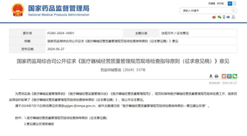 6月28日,國家藥監(jiān)局發(fā)布《醫(yī)療器械經(jīng)營質(zhì)量管理規(guī)范現(xiàn)場檢查指導(dǎo)原則(征求意見稿)》(以下簡稱《指導(dǎo)原則》),并向社會公開征求意見。