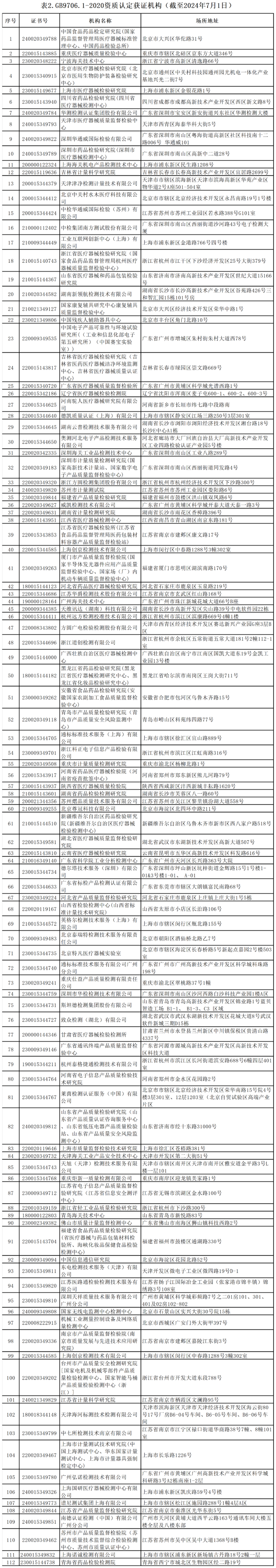 我們從附件表格中可以看到,目前全國共有112家GB 9706.1-2020資質認定獲證機構及132家YY 9706.102-2021獲證機構,以下僅以圖片形式展示GB 9706.1-2020資質認定獲證機構.