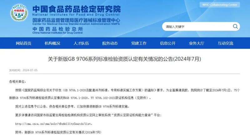 近日,中檢院官網(wǎng)公布了截至2024年7月1日,75個新版GB 9706系列標準檢驗資質認定情況和GB 9706.1-2020、YY 9706.102-2021獲證機構信息。