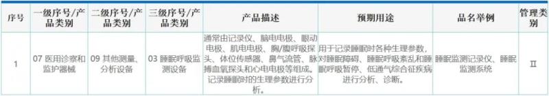 睡眠呼吸監(jiān)測儀在我國作為第二類醫(yī)療器械管理,其產(chǎn)品描述如下:“通常由記錄儀、腦電電極、眼動電極、肌電電極、胸/腹呼吸探頭、體位傳感器、鼻氣流管、脈搏血氧探頭和心電電極等組成。記錄睡眠時的生理參數(shù)進(jìn)行分析”,預(yù)期用途為“用于記錄睡眠時各種生理參數(shù),對睡眠障礙、睡眠呼吸紊亂和睡眠呼吸暫停、低通氣綜合征疾病進(jìn)行分析、診斷”,常見名稱還有“睡眠監(jiān)測記錄儀”“睡眠監(jiān)測系統(tǒng)”等,分類編碼07-09-03。
