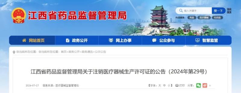 7月17日,江西省藥監(jiān)局發(fā)布公告稱,該局已依法注銷江西海川藥業(yè)有限公司、江西萬鑫醫(yī)療科技有限公司等4家企業(yè)的《醫(yī)療器械生產(chǎn)許可證》,注銷原因均為“企業(yè)主動申請注銷”,具體明細(xì)如下: