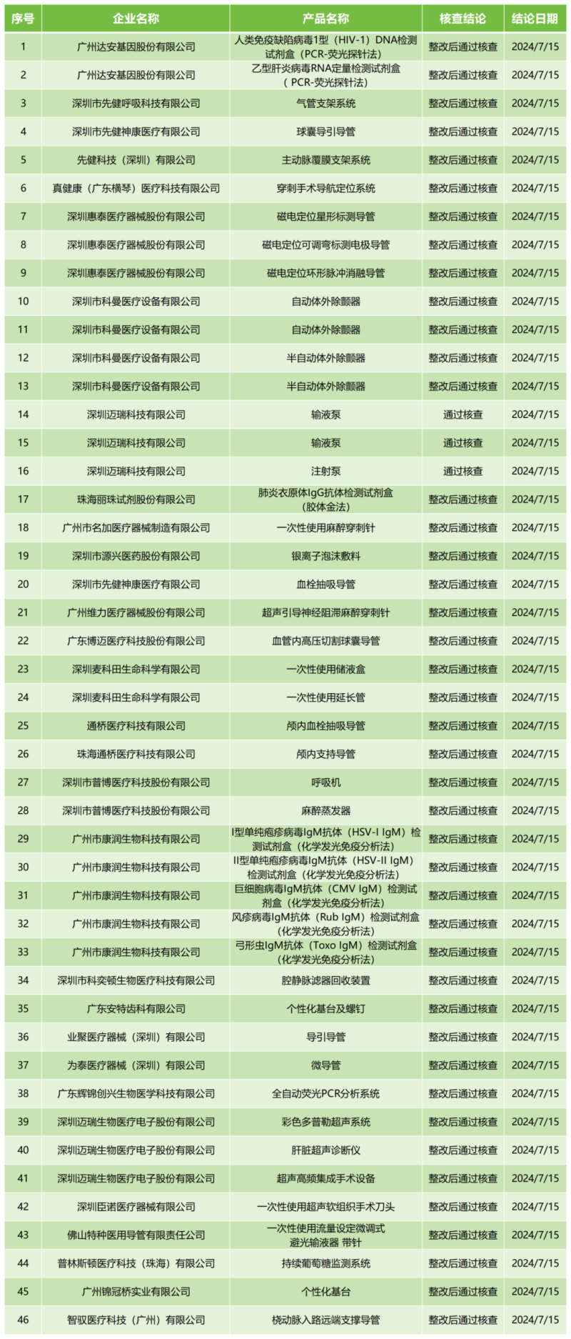 8月6日,廣東省藥監(jiān)局官網(wǎng)公布2024年7月醫(yī)療器械注冊質(zhì)量管理體系核查結(jié)果,包括深圳市科曼醫(yī)療設備有限公司的自動體外除顫器、深圳邁瑞科技有限公司的輸液泵、深圳市源興醫(yī)藥股份有限公司的銀離子泡沫敷料等共計46款產(chǎn)品,其中深圳邁瑞科技有限公司的3款產(chǎn)品為“通過核查”,其余均為“整改后通過核查”。具體明細見下方表格: