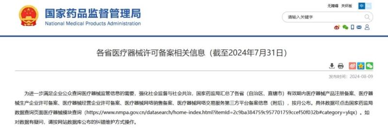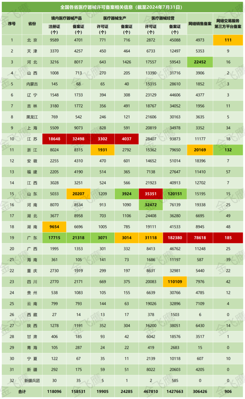 近日,國(guó)家藥監(jiān)局公布了截至2024年7月31日各省有效期內(nèi)醫(yī)療器械產(chǎn)品注冊(cè)備案、醫(yī)療器械生產(chǎn)企業(yè)許可備案等信息,老規(guī)矩,金飛鷹小編對(duì)此稍作編輯,標(biāo)注紅色、綠色、黃色的分別為前三甲。
