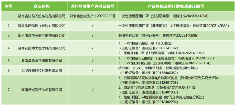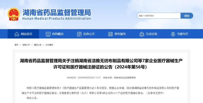 8月26日,湖南省藥監(jiān)局發(fā)布公告稱,按照《醫(yī)療器械監(jiān)督管理條例》《醫(yī)療器械生產(chǎn)監(jiān)督管理辦法》有關(guān)規(guī)定,根據(jù)企業(yè)申請,現(xiàn)注銷湖南省潔雅無紡布制品有限公司的醫(yī)療器械生產(chǎn)許可證和醫(yī)療器械注冊證;注銷復(fù)星診斷科技(長沙)有限公司6家企業(yè)的10個產(chǎn)品的醫(yī)療器械注冊證,具體明細(xì)如下: