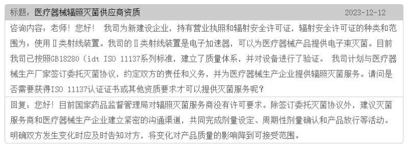 根據(jù)國(guó)家藥監(jiān)局食品藥品審核查驗(yàn)中心的答復(fù),目前國(guó)家藥品監(jiān)督管理局對(duì)輻照滅菌服務(wù)商沒(méi)有許可要求。除簽訂委托滅菌協(xié)議外,建議滅菌服務(wù)商和醫(yī)療器械生產(chǎn)企業(yè)建立緊密的溝通渠道,共同完成劑量設(shè)定、周期性劑量確認(rèn)和產(chǎn)品放行等活動(dòng)。明確雙方發(fā)生變化時(shí)應(yīng)及時(shí)告知對(duì)方,將變化對(duì)產(chǎn)品質(zhì)量的影響降到可接受范圍。