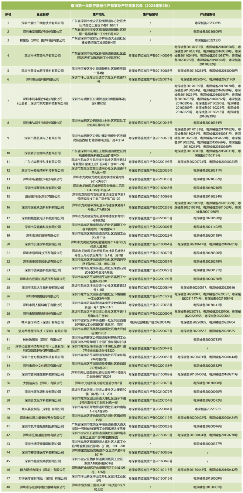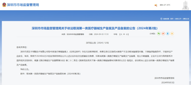 9月3日,深圳市市場(chǎng)監(jiān)督管理局官網(wǎng)發(fā)布一則取消第一類醫(yī)療器械生產(chǎn)備案及產(chǎn)品備案的公告,該公告指出,因深圳市潤(rùn)生干細(xì)胞技術(shù)有限公司、深圳市幸福醫(yī)療科技有限公司、深圳市格萊美電子有限公司等48家醫(yī)療器械備案人存在無(wú)法取得聯(lián)系、商事主體已注銷(xiāo)或長(zhǎng)期停產(chǎn)不主動(dòng)取消備案等問(wèn)題,不具備原備案條件,不能保證產(chǎn)品安全、有效,該局在公示期結(jié)束后決定取消這些企業(yè)名下的第一類醫(yī)療器械生產(chǎn)備案及產(chǎn)品備案,具體明細(xì)如下: