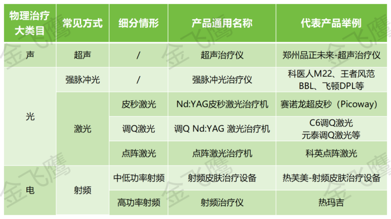 對醫(yī)療器械行業(yè)稍有了解的朋友應(yīng)該都聽過“聲光電”,這是幾種物理治療方式的簡稱,它們在醫(yī)美產(chǎn)品領(lǐng)域的應(yīng)用極為廣泛。這里的“聲”指的是超聲;“光”的形式則有多種,如激光、強脈沖光、紅藍光、紫光等,而就激光來說,又分為皮秒激光、調(diào)Q激光、點陣激光等,強脈沖光常見代表性產(chǎn)品則有M22、BBL、王者風(fēng)范等;電學(xué)類產(chǎn)品最常見的則是熱瑪吉,主要利用電能作用于人體組織產(chǎn)生熱效應(yīng),以實現(xiàn)減輕皮膚皺紋等作用。