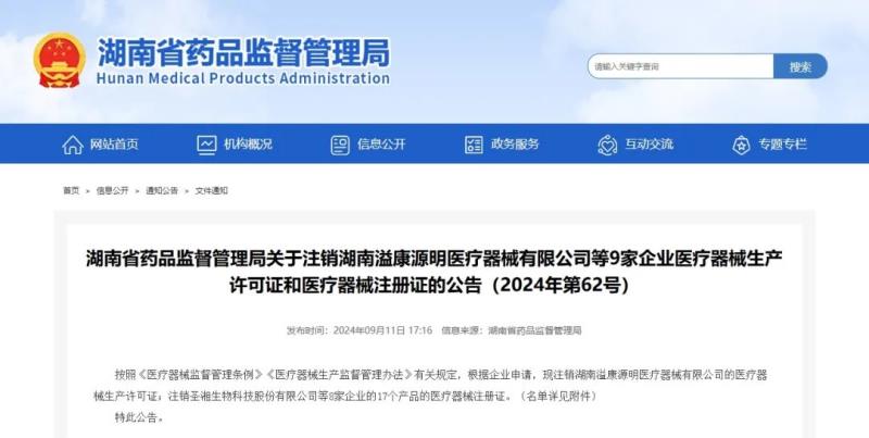 9月11日,湖南省藥監(jiān)局發(fā)布公告稱,按照《醫(yī)療器械監(jiān)督管理條例》《醫(yī)療器械生產(chǎn)監(jiān)督管理辦法》有關(guān)規(guī)定,根據(jù)企業(yè)申請,現(xiàn)注銷湖南溢康源明醫(yī)療器械有限公司的醫(yī)療器械生產(chǎn)許可證;注銷圣湘生物科技股份有限公司等8家企業(yè)的17個產(chǎn)品的醫(yī)療器械注冊證,具體明細如下: