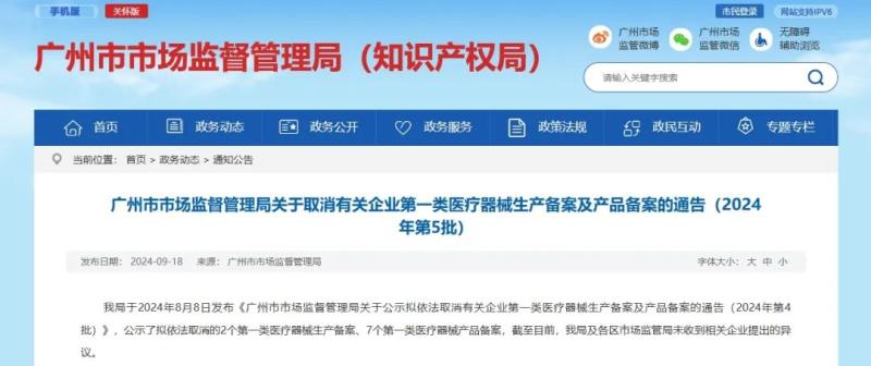 9月18日,廣州市市場(chǎng)監(jiān)督管理局官網(wǎng)發(fā)布一則取消第一類醫(yī)療器械生產(chǎn)備案及產(chǎn)品備案的通告,通告指出,因廣東嘉雅醫(yī)療器械有限公司、廣州市歐之康醫(yī)療器械有限公司未在備案場(chǎng)所經(jīng)營(yíng)且無(wú)法聯(lián)系,在公示期間該局及各區(qū)市場(chǎng)監(jiān)管局未收到相關(guān)企業(yè)提出的異議。