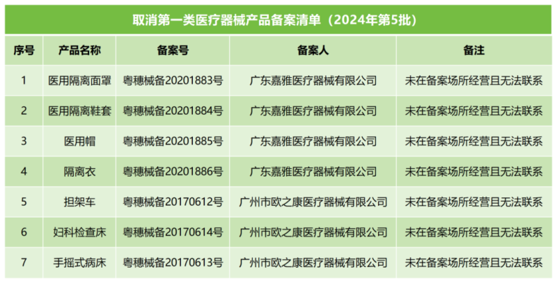 因此,該局現(xiàn)公告取消以上兩家企業(yè)的2個(gè)第一類醫(yī)療器械生產(chǎn)備案(備案號(hào)分別為粵穗食藥監(jiān)械生產(chǎn)備20200352號(hào)&粵穗食藥監(jiān)械生產(chǎn)備20170092號(hào)),以及7個(gè)第一類醫(yī)療器械產(chǎn)品備案,其中產(chǎn)品備案取消的具體清單如下: