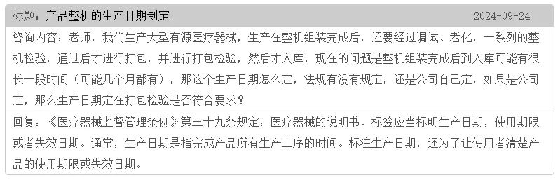 根據(jù)國(guó)家藥監(jiān)局食品藥品審核查驗(yàn)中心的答復(fù),《醫(yī)療器械監(jiān)督管理?xiàng)l例》第三十九條規(guī)定:醫(yī)療器械的說明書、標(biāo)簽應(yīng)當(dāng)標(biāo)明生產(chǎn)日期,使用期限或者失效日期。通常,生產(chǎn)日期是指完成產(chǎn)品所有生產(chǎn)工序的時(shí)間。標(biāo)注生產(chǎn)日期,還為了讓使用者清楚產(chǎn)品的使用期限或失效日期。